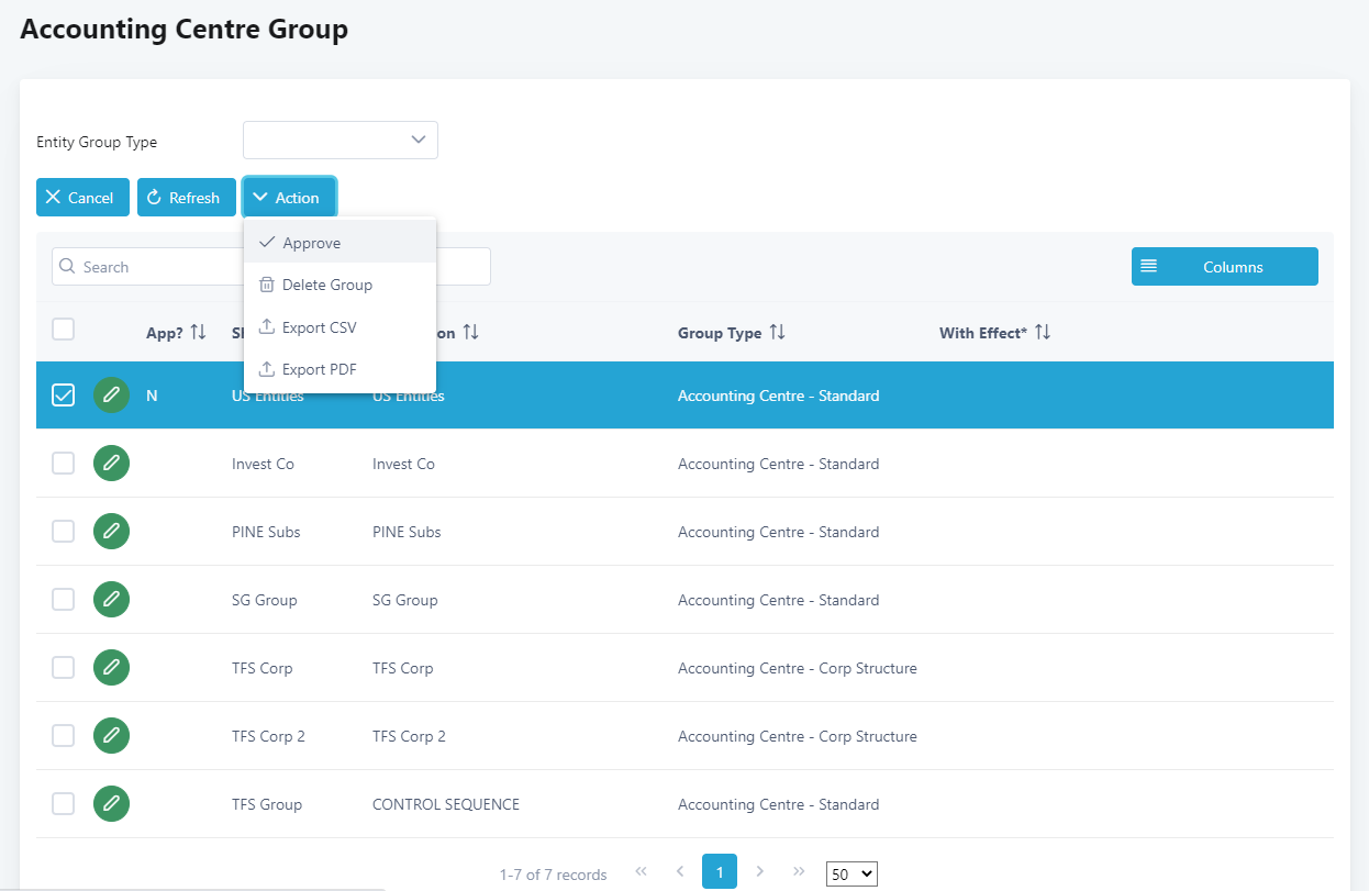 14. From the main Accounting Centre Group screen, click on the tick box next to the accounting centre group which was amended.