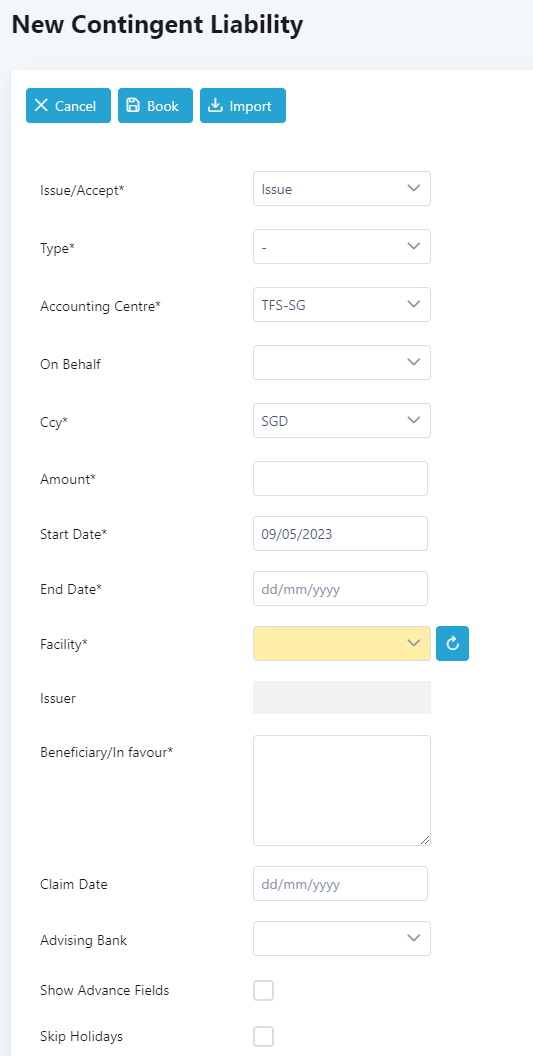 12. Choose the Facility from the dropdown. As you do this, the system recomputes the available limit for the contingent liability to be book and Issuer will be populated according to the selected facility.