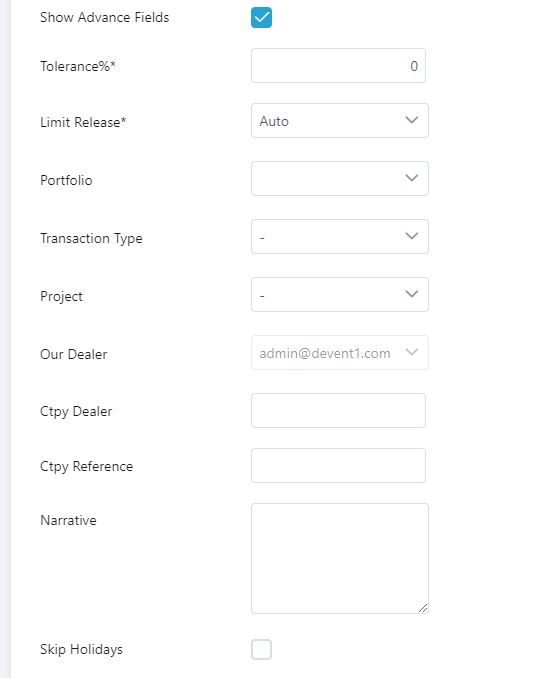 18. The system checks for holidays before booking the trade, if you want the system to skip checking, tick on the Skip Holidays checkbox.