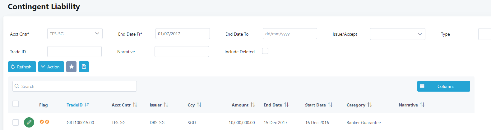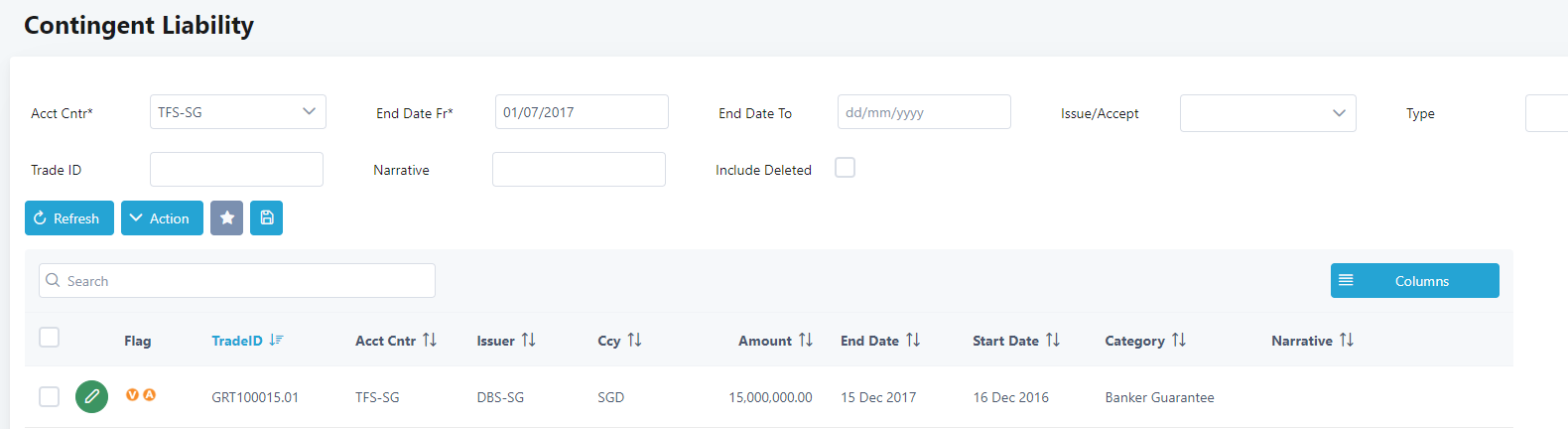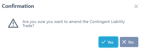 22. To amend a contingent liability, click on the Edit button of the trade. In this example we will select the one recently entered. The Amend Contingent Liability screen will be displayed.