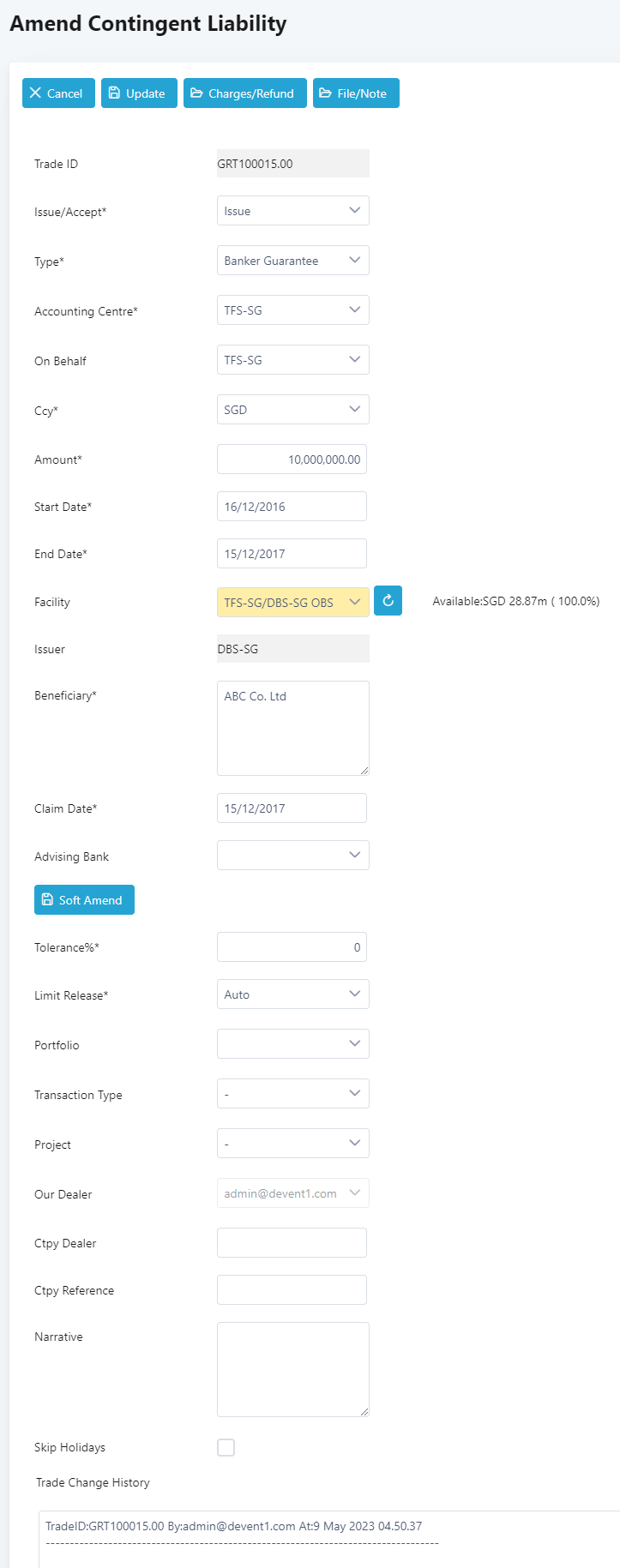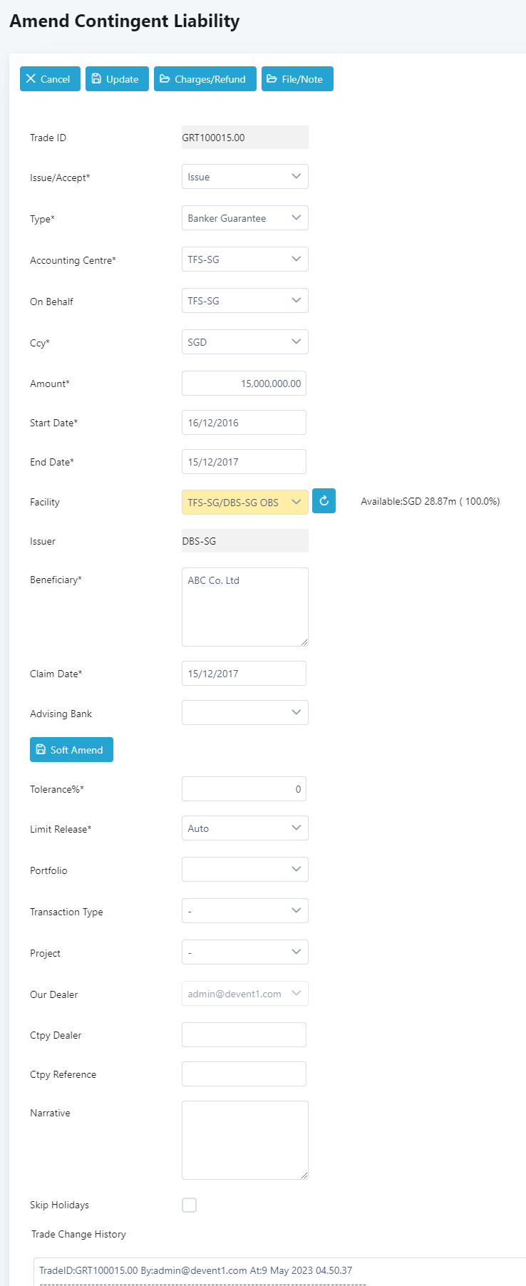 23. Change the values as necessary. Note that the Trade Change History below the page will show all the amendments made on the transaction.