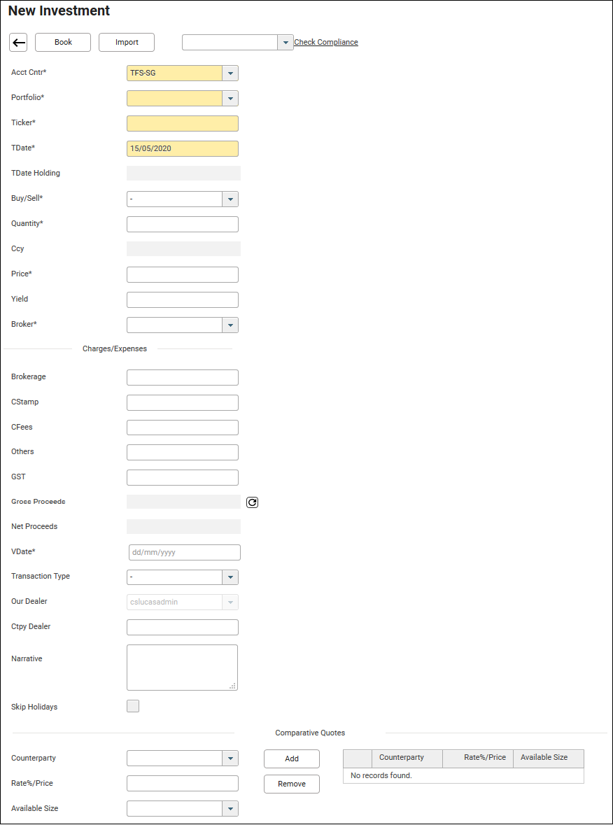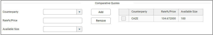 15. To maintain comparative quotes information for the investment trade, select the Counterparty from the drop down box, key in the Rate%/Price in free text form and select Available Size from the drop down box.