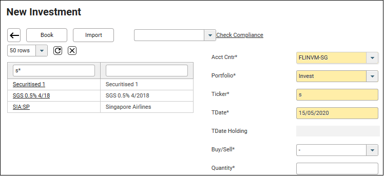 5. Choose the Ticker. If unsure of the ticker name, type the first letter and click tab. All the securities starting with “s” will be displayed. In this example, SIA:SP will be chosen. Click on SIA:SP. The system will fill in the Ticker. If you know the ticker, enter it “sia:sp” case insensitive. The system will format the case based on the security set up. If you do not find the desired security, please see How to Set Up Security.