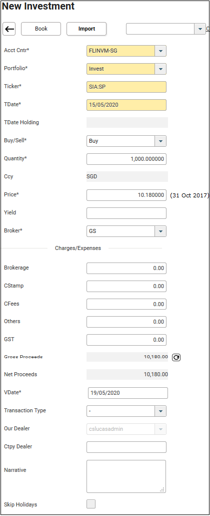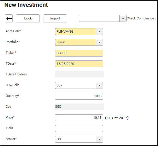 9. Price is displayed with the last available price available on Security Prices on the selected TDate by default. Edit the price as necessary if required.