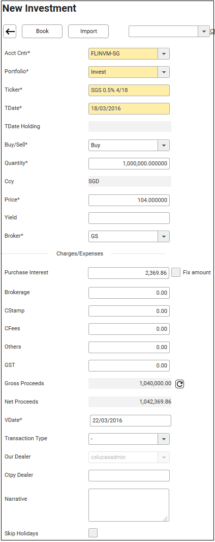 This allows the capture of investments in securities such as equity stocks or bonds in CS Lucas system.