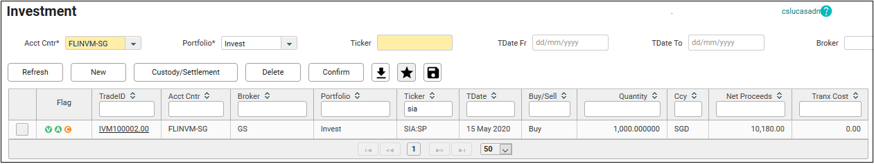 22. The custodian and settlement information can also be maintained from the launch screen of Investment. First, choose the transaction by clicking on the checkbox next to the TradeID.