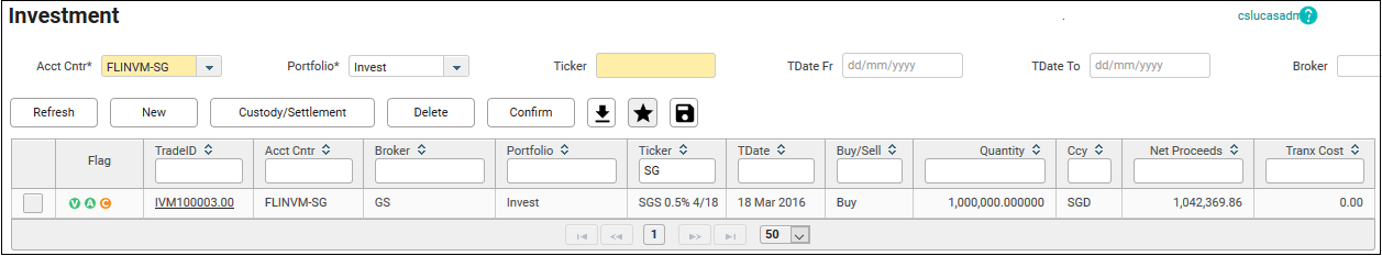 17. To see the transaction, filter the Acct Cntr and the Portfolio on the main screen, then click Refresh. You can also zoom in the search by filtering the Ticker, TDate Fr, and TDate To fields.
