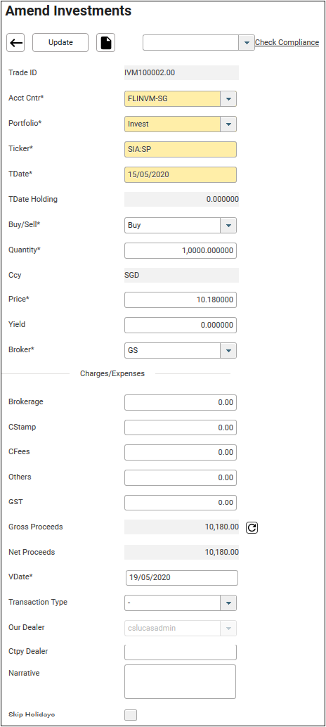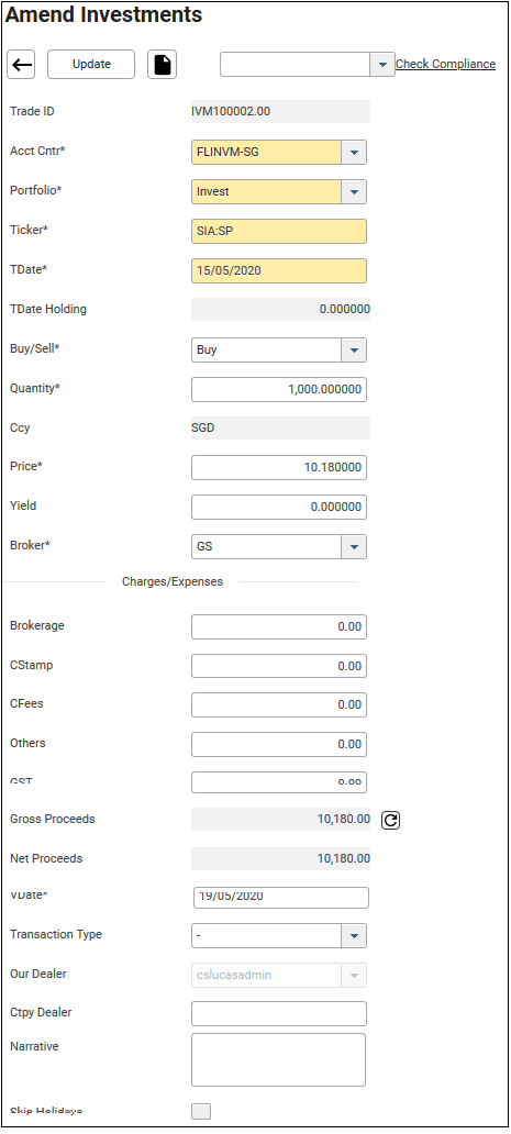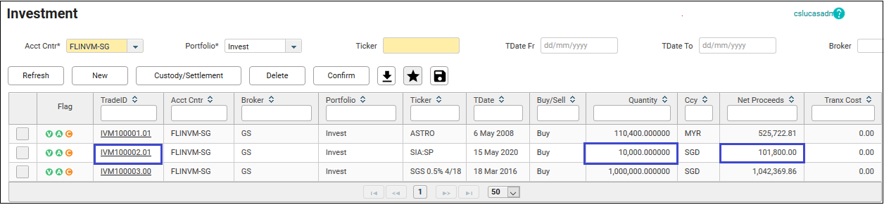 18. To amend the transaction, click on the TradeID. In this example, IVM100002.00 will be chosen. The Amend Investment screen will be displayed.