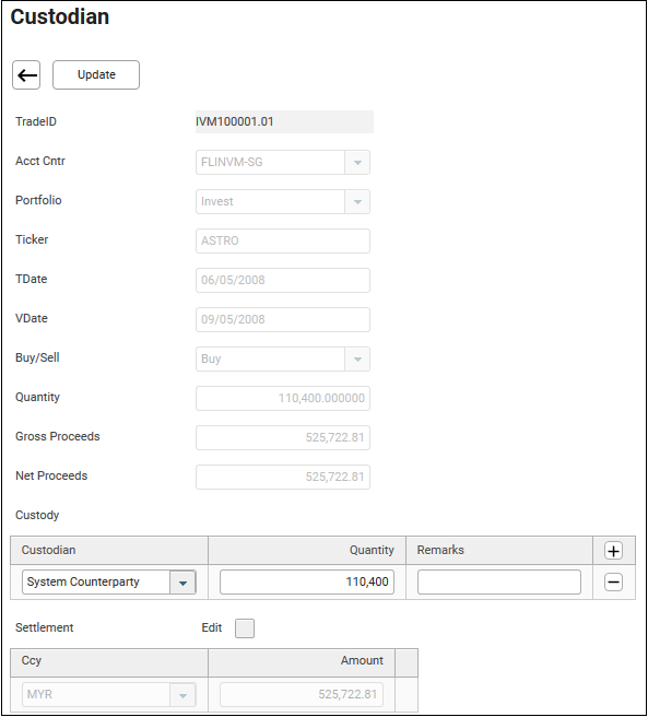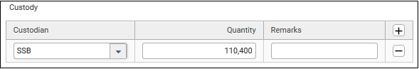 24. Select the custodian from the dropdown field. If you do not find the desired custodian, please see How to Set Up Entity – Counterparty. If you need to add more custodians, click Add Button, and another row appears. Quantity may be split between custodians. In this example, only one custodian will be added.