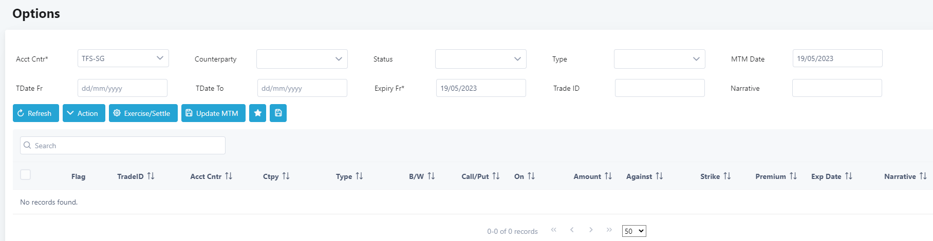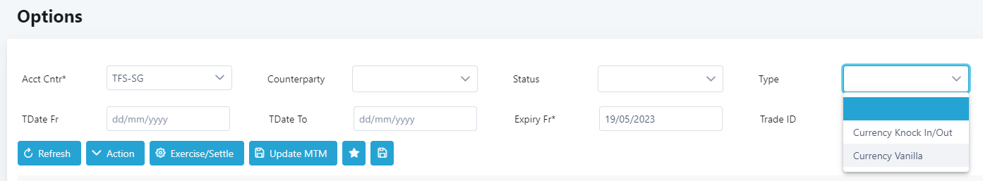18. To view the trades created, inquire by filtering the fields on the top of the transaction listing accordingly. Acct Cntr and Expiry From fields are mandatory. Then, click Refresh.