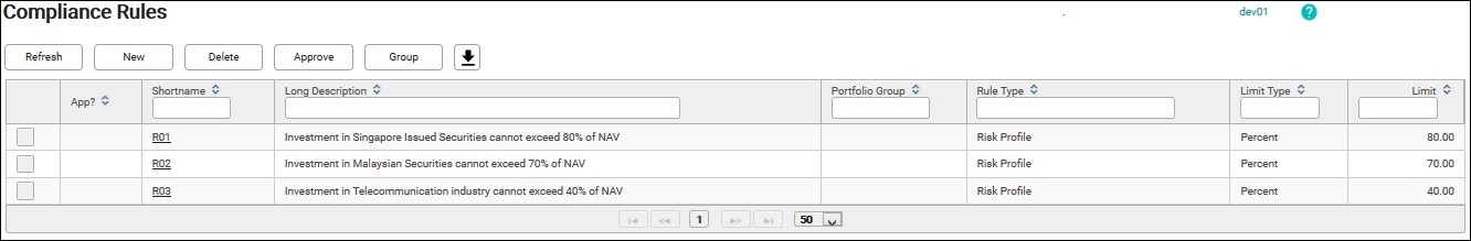 In order for compliance rules to be applied and tested against investment holding of a portfolio, the relevant rules must first be assigned to a Compliance Rule Group and then the Group is assigned to a portfolio.