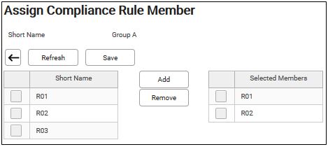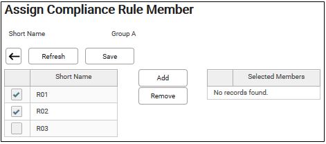8. Choose the compliance rule to add by clicking on the check box beside the Short Name of the rule. In this example, R01 and R02 will be selected.