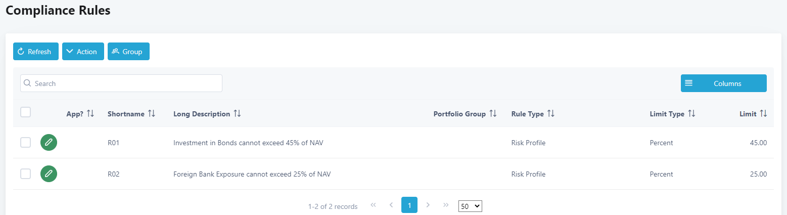 In order for compliance rules to be applied and tested against investment holding of a portfolio, the relevant rules must first be assigned to a Compliance Rule Group and then the Group is assigned to a portfolio.