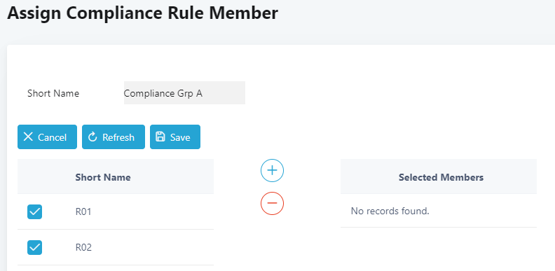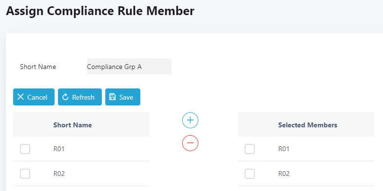 8. Choose the compliance rule to add by clicking on the check box beside the Short Name of the rule. In this example, R01 and R02 will be selected.