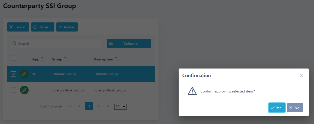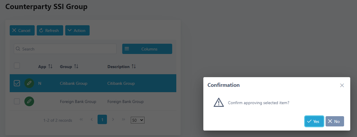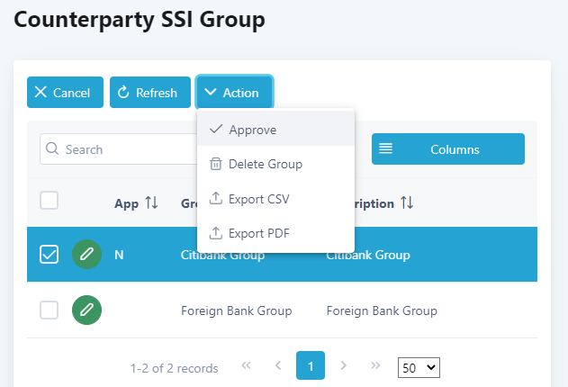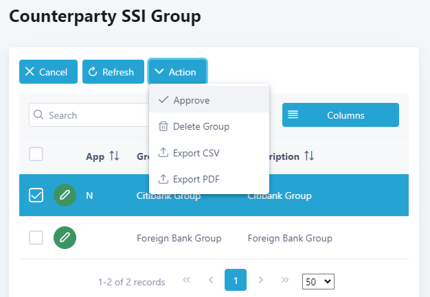 19. Approve the counterparty SSI group by ticking the checkbox beside the short name and click Action and Approve. If you do not see approval status set to “N” after making changes for the counterparty SSI group, click Refresh to refresh the screen.
