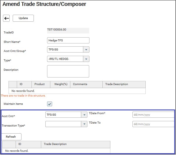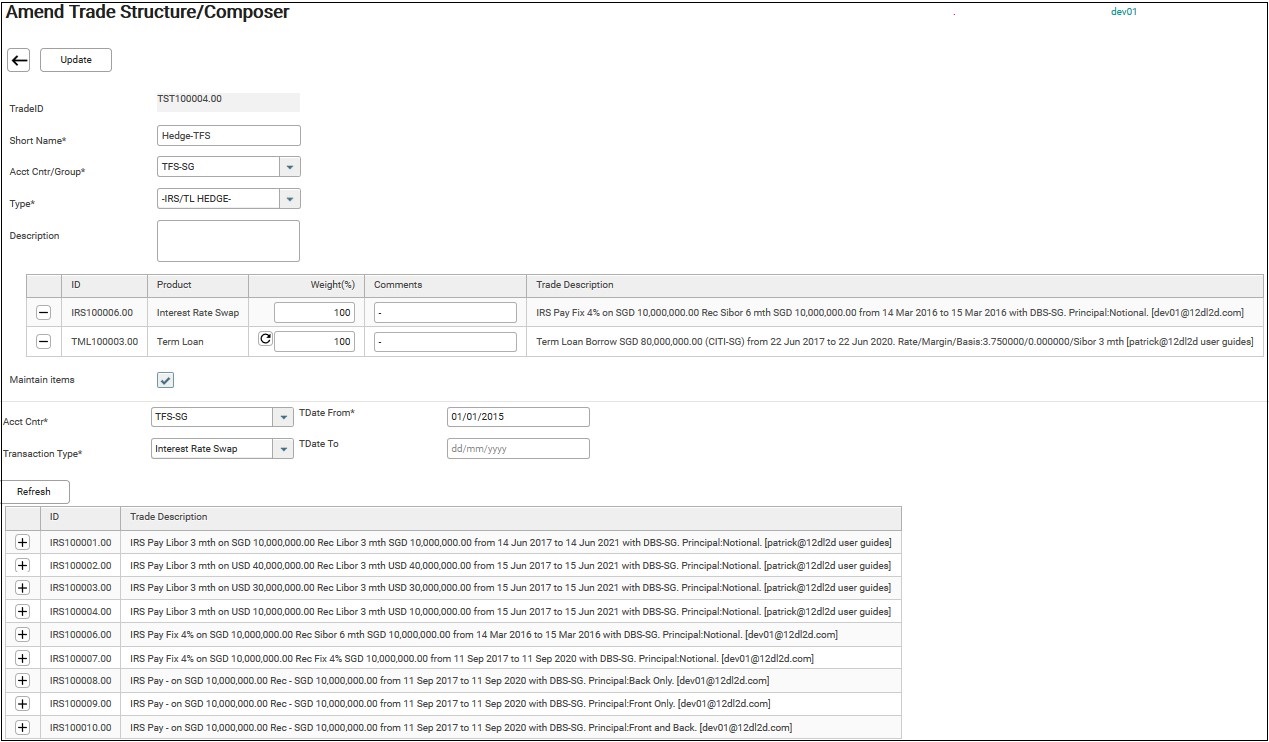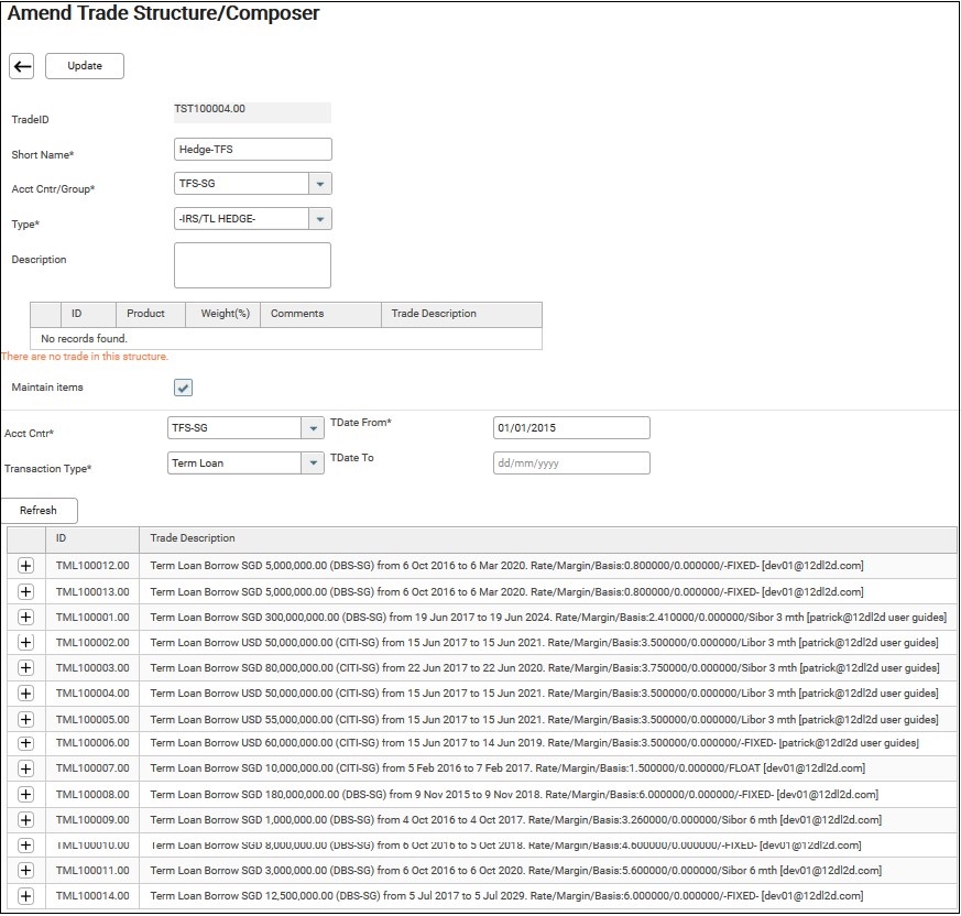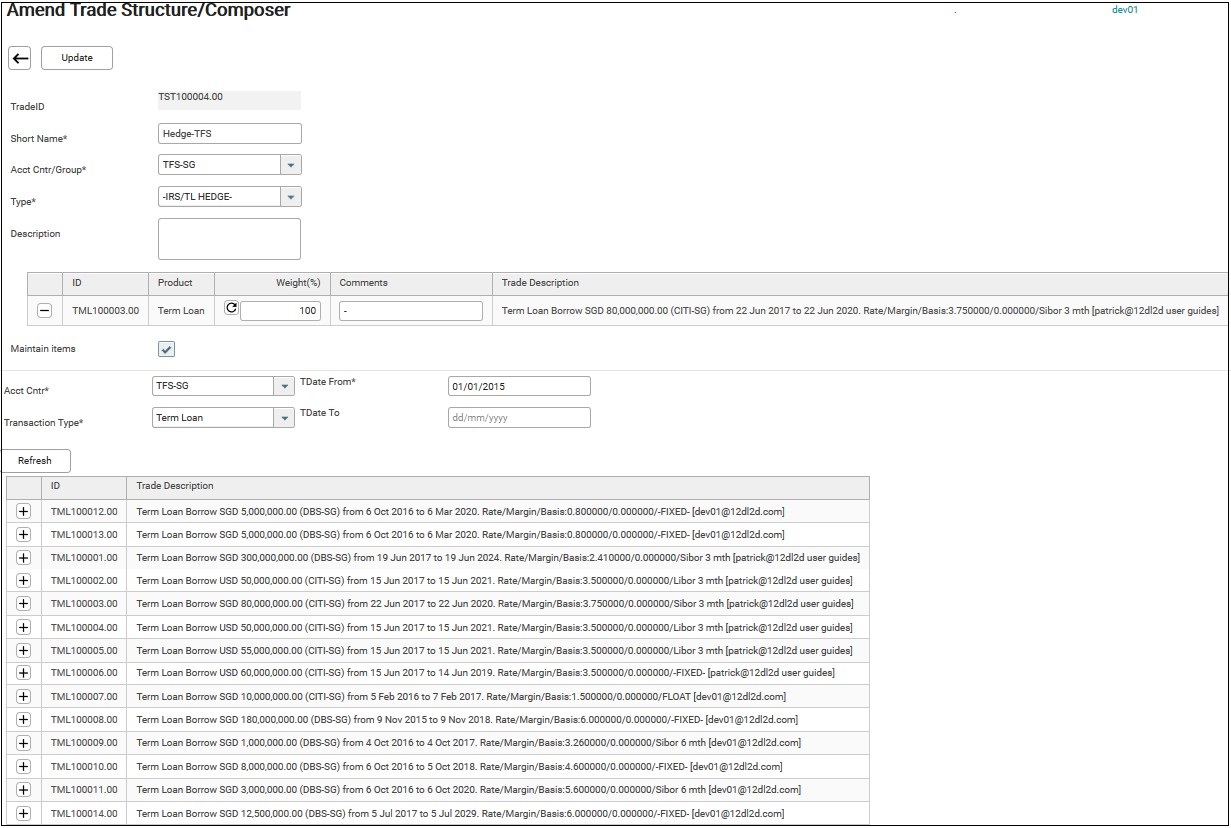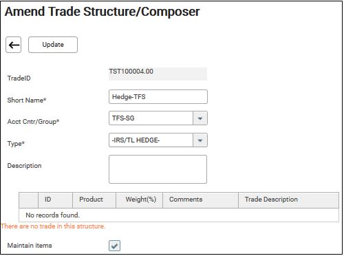 10. Once the trade structure created, click on the Trade ID to drill down to Amend Trade Structure/ Composer screen. Tick on the Maintain items checkbox to group/ link trades.