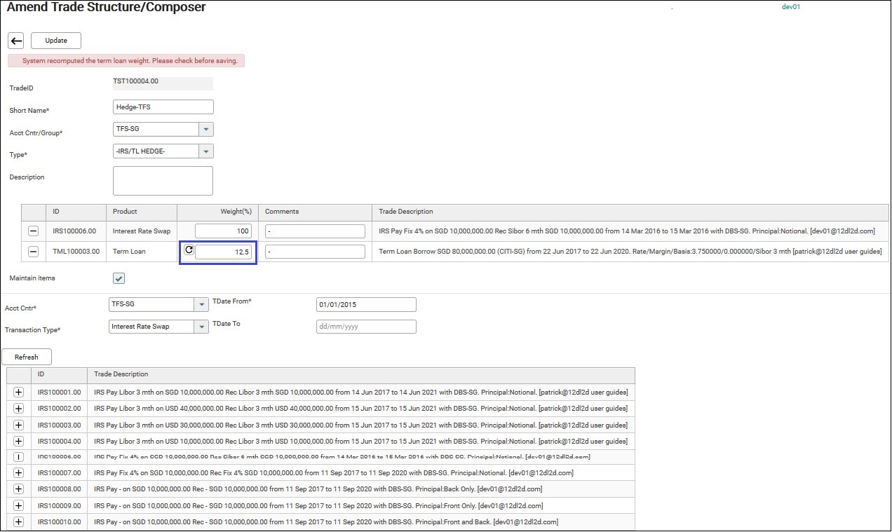 17. Click Update after the trade structure is properly set. Note that the weighting can be overwritten, change the values directly to the Weight(%) field and update.