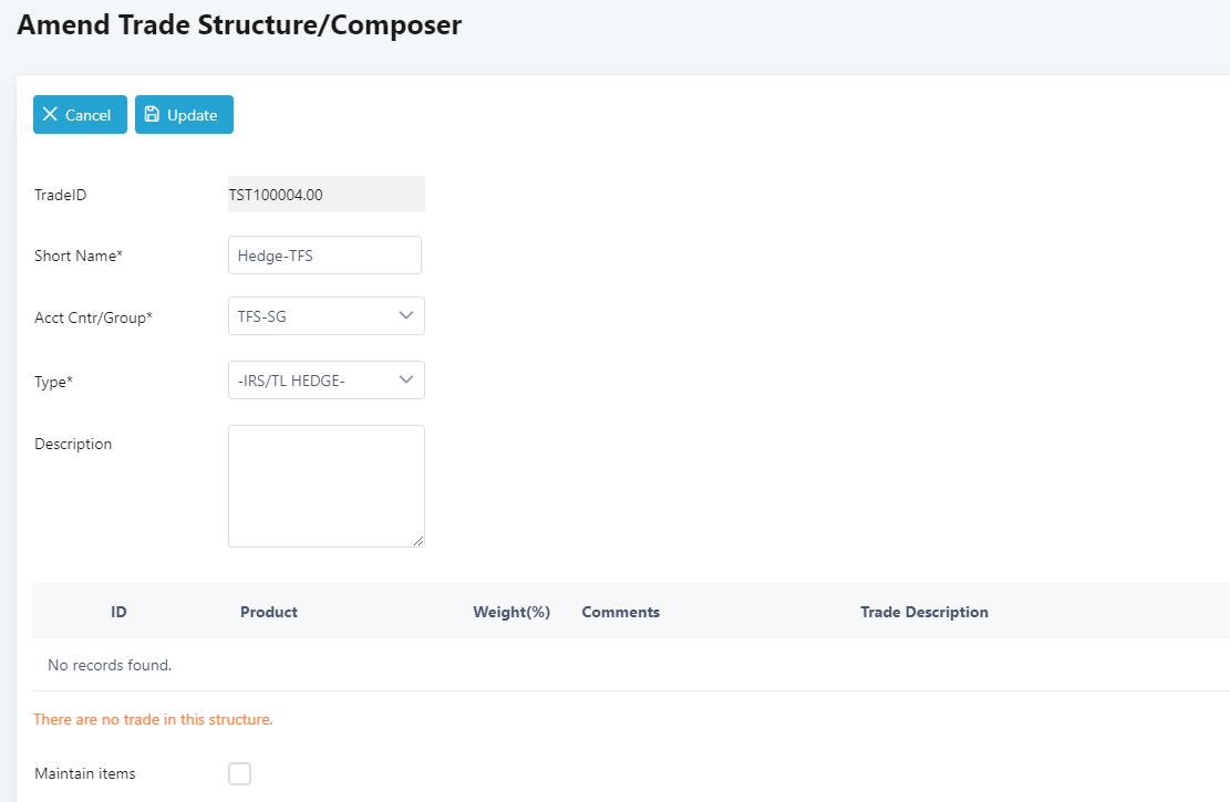 7. Click Update. The Trade Structure/Composer main screen will show the newly created trade structure in the listing. The newly created trade structure will show with an N.