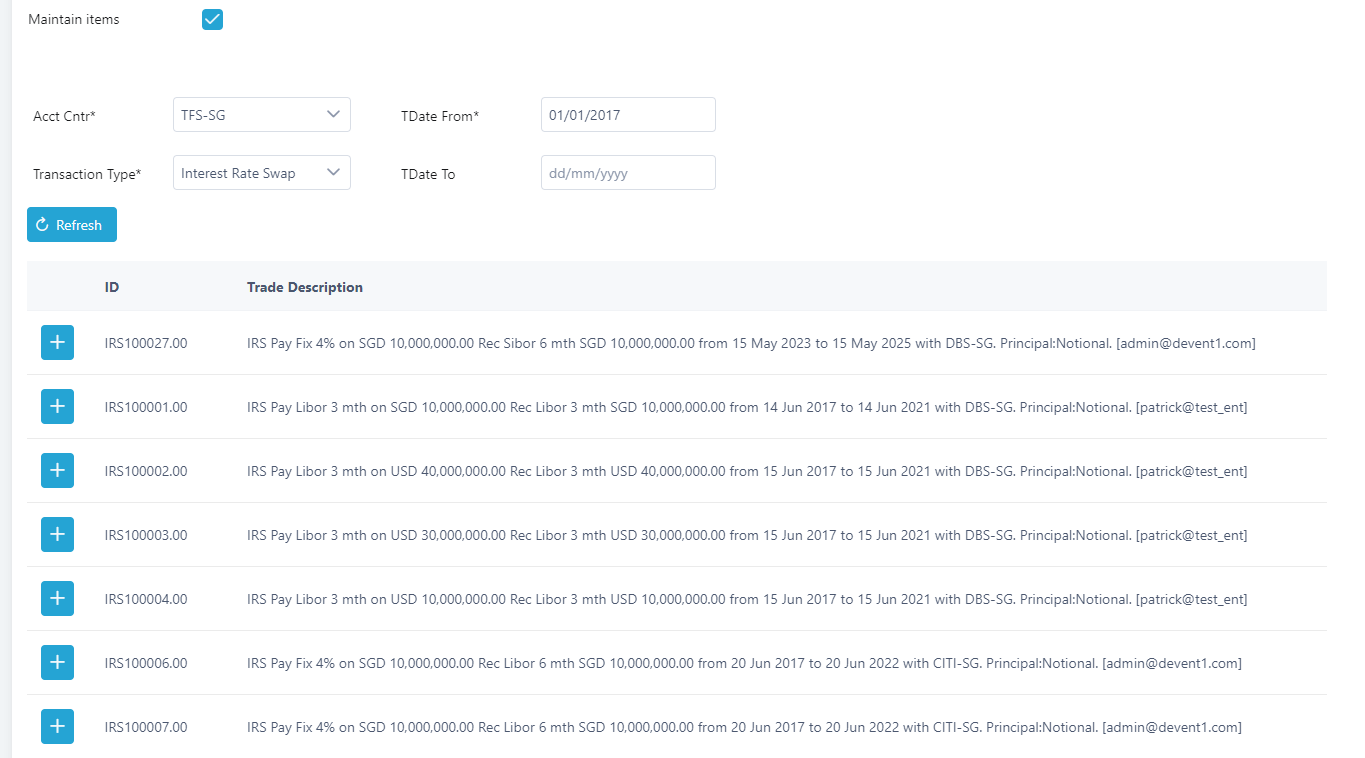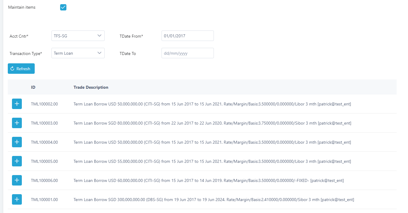 12. Choose the accounting centre, select the transaction type as Term Loan, TDate from 1-Jan-2017 and click Refrresh. System will filter out Term Loan trades which trade date start from 1-Jan-2017.