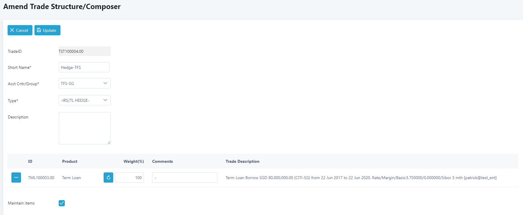 11. Tick on the Maintain items checkbox to group/ link trades. More fields will be displayed at the bottom of the page for you to filter out trades. Select the Accounting Centre, Transaction Type and TDate From. In this example, we will group one Term Loan and one Interest Rate Swap trade.