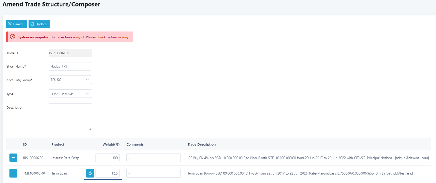 17. Click Update after the trade structure is properly set. Note that the weighting can be overwritten, change the values directly to the Weight(%) field and update.