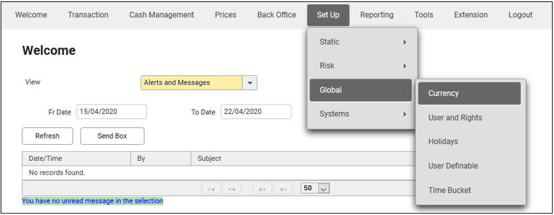 1. From the main menu, select Set Up > Global > Currency.