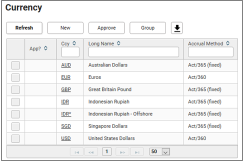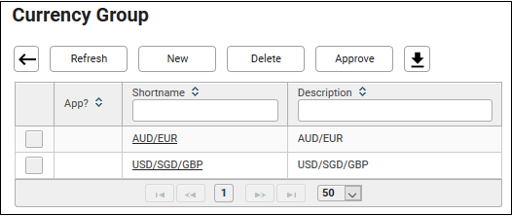 Launching to Currency Group allows viewing, creating, amending and deleting currency groups.