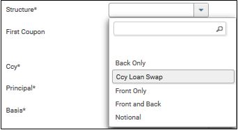 4. Next, choose Ccy Loan Swap as the structure type. When this is selected, system will create the trade in exactly the same way as an IRS with a Front and Back exchange. However, it allows interim principal exchanges by updating the structure subsequently.