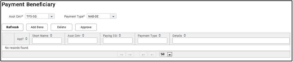 Tip: If you do not see the Payment Beneficiary in the menu navigation, please ensure that you have the access rights to access this screen. Access rights required is 19800 Access Payment Beneficiary.
