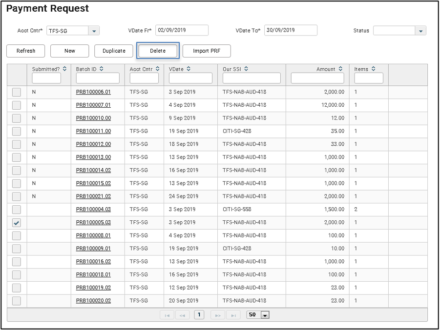 4. To delete a payment request, tick on the checkbox of the payment batch you wish to delete and click Delete.