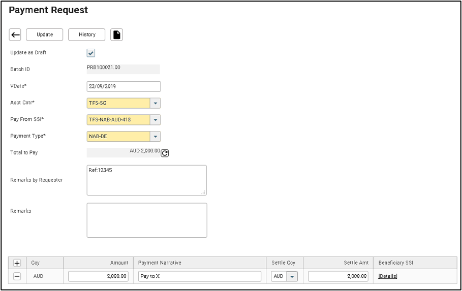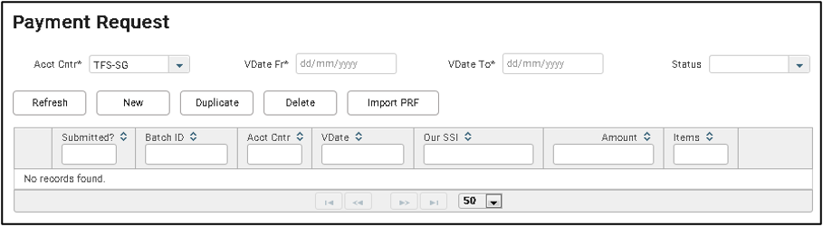 Tip: If you do not see the Payment Request in the menu navigation, please ensure that you have the access rights to access this screen. Access rights required is 19400 Access Payment Request.