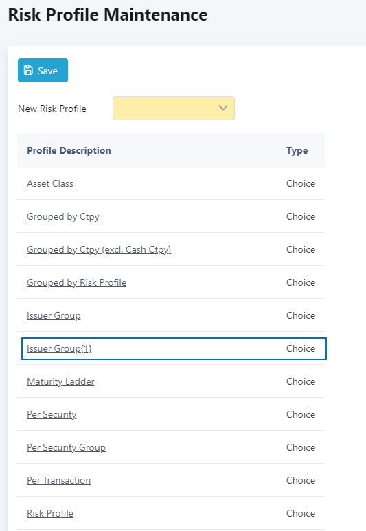 5. Newly duplicated risk profile will have {1} appended. In this example, “Issuer Group{1}”.