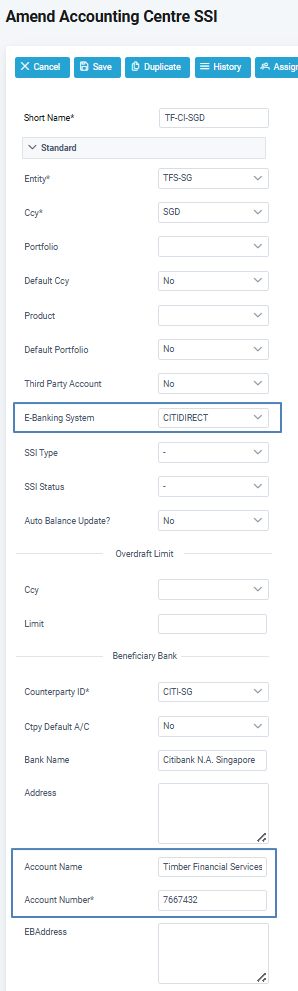 In the Amend Accounting Centre SSI screen, select the e-banking system from the E-Banking System field. In this example, we will choose CITIDIRECT.