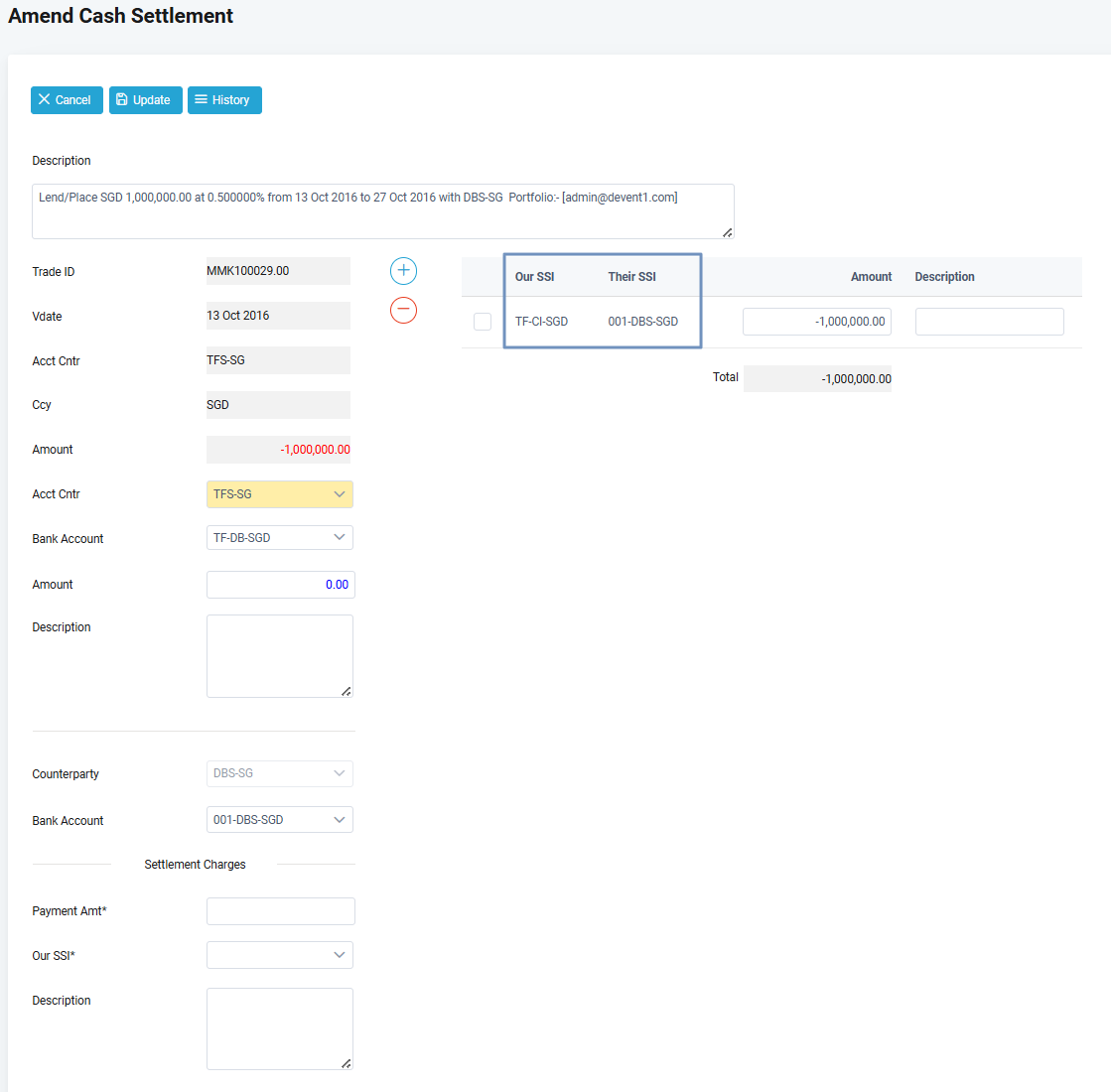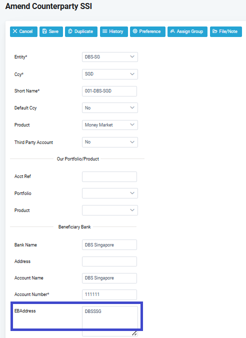 8. Go to Set Up > Static > Settlement Instructions > Counterparty SSI > Click on the Counterparty SSI , for e.g., 001-DBS-SGD. Ensure Account Name, Account Number and SWIFT Code are set up.