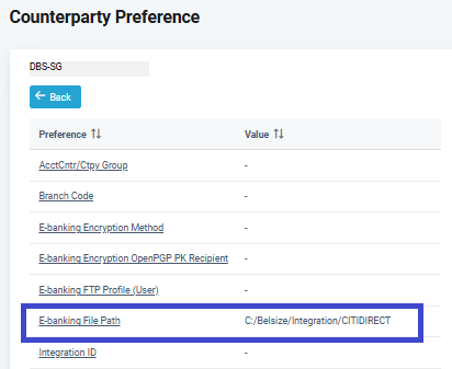 - Set up the location for saving the generated e-banking file. This is done at the Counterparty Preference. From main menu, click Set Up > Static > Counterparty. In the Counterparty Screen, click on the E-banking File Path.Enter the location path where the e-banking file will be pushed to. In this example, it will be pushed to C:\ drive, in the “Integration” and “CITIDIRECT” folder.