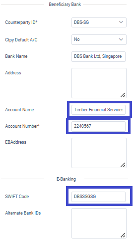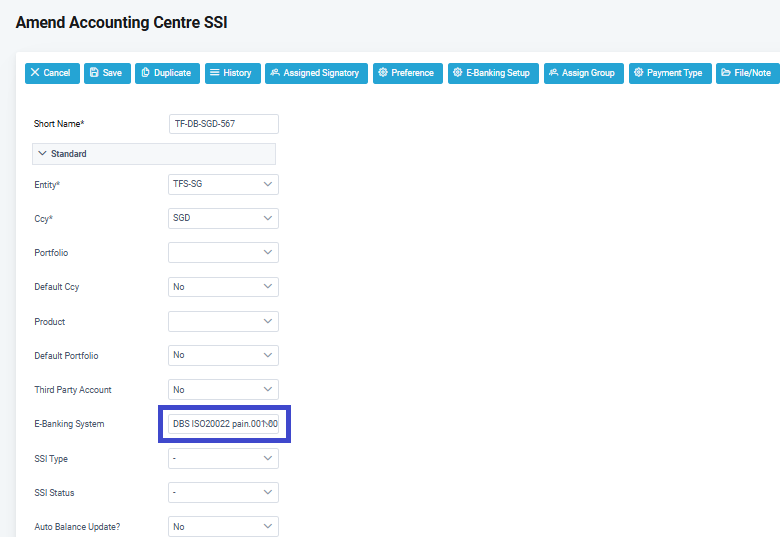 2. Set E-Banking Setup information for SSI, for example, TFS-DBS-SGD-567.