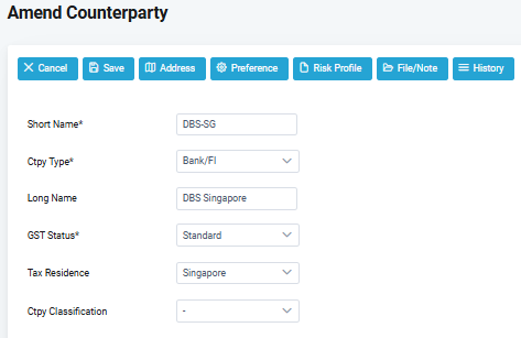9. Go to Set Up > Static > Counterparty > Click on DBS-SG .