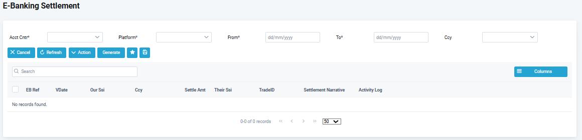 2. From the Cash Settlement screen, click E-banking. The E-Banking Settlement screen will be displayed.