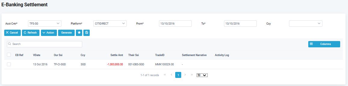3. Pull out the trades to be settled electronically by choosing the Accounting Centre, Platform, From and To Dates. In this example, we will pull out trades to be settled today, which is 13-Oct-2016 and the platform chosen is CITIDIRECT.