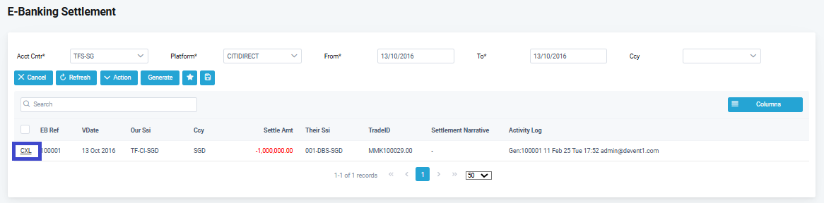 8. Once generated, it cannot be regenerated anymore. If needed, the e-banking transaction can be cancelled by clicking on CXL. This cancellation does not generate any cancellation instruction to the bank, it is to only allow user to re-generate the e-banking file.