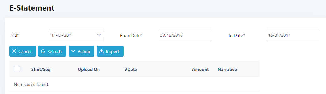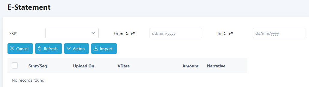 3. To retrieve the statements imported for a bank account for a specific date or date range, select the SSI, From Date and To Date. Then, click on Refresh button.