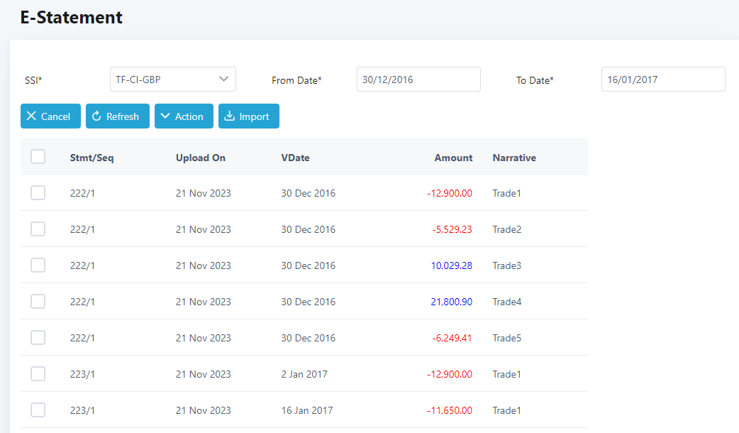 4. Statements imported will be displayed for the selected SSI and date(s).