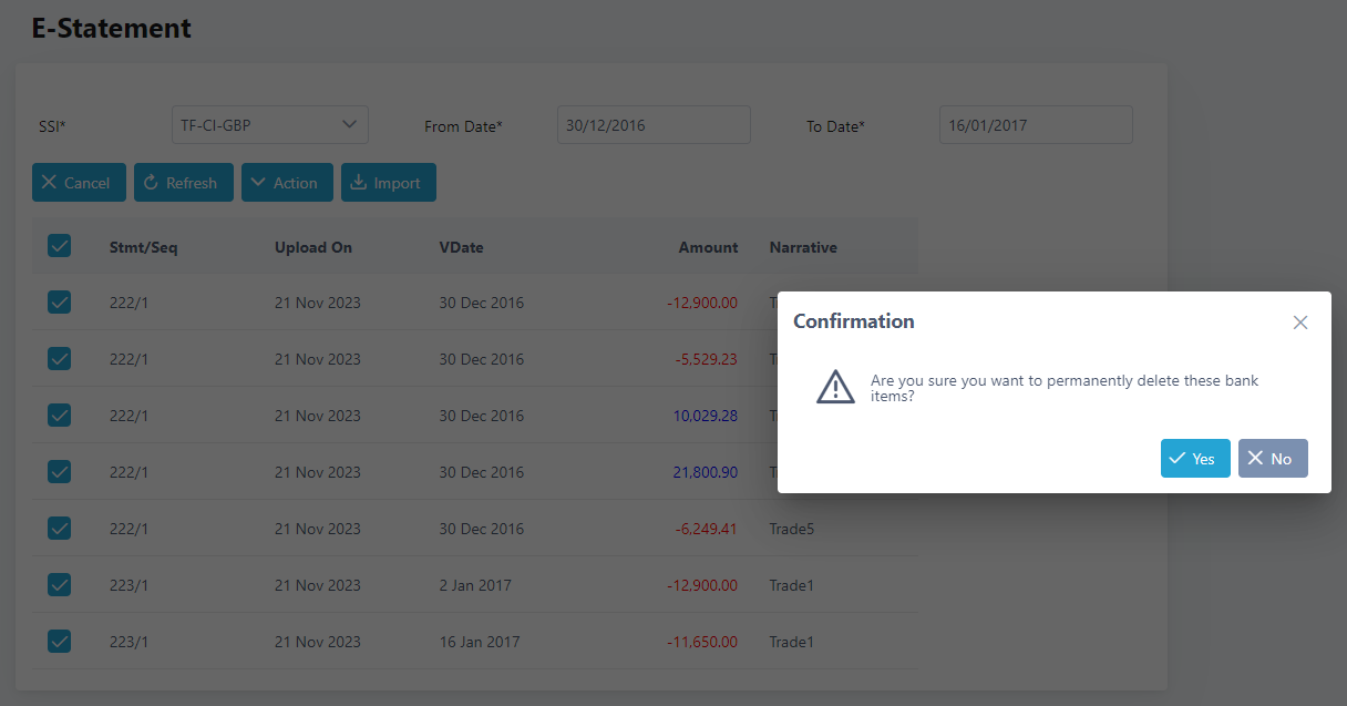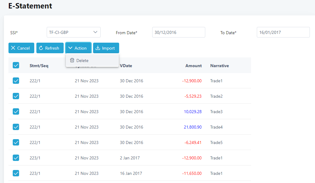 5. To delete statements imported in the system, click on the checkbox of the statements to delete, or select all to delete all statements and click on Action and select Delete.