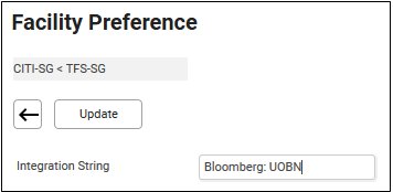 For Bloomberg’s FX trade integration, this is Bank 1 Dealing Code from the Bloomberg integration file. For example, Bloomberg: UOBN. Click on the Integration String hyperlink to enter the value. Click Update. |