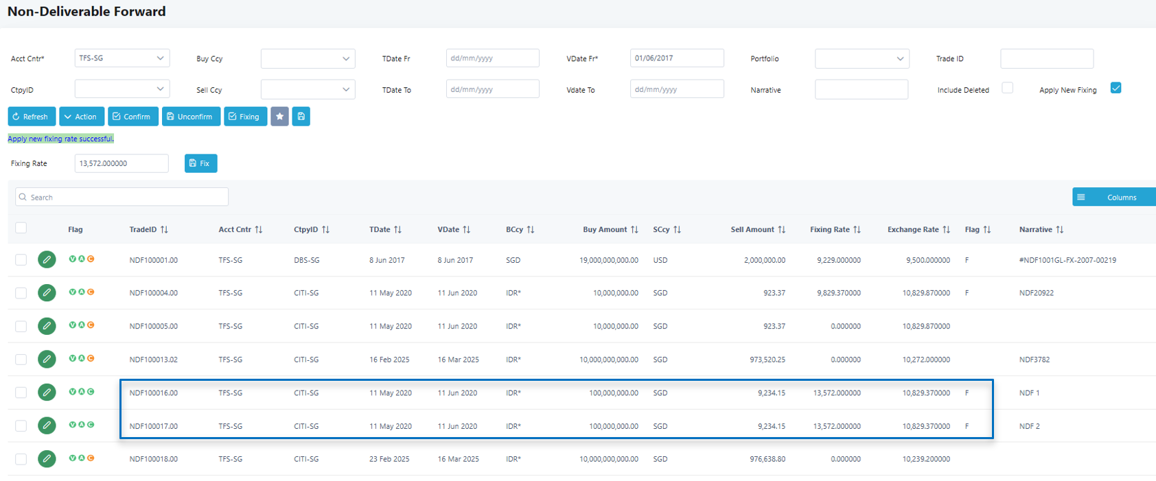 2. You will see the message “Apply new fixing rate successful,” and the selected trades will now be fixed.