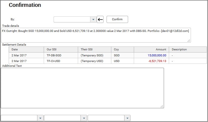 Please note that with the multiple confirm trades feature, the system will only verify if you have the access rights. If granted, the system will mark the trades as confirmed. There are no additional checks or process logic implemented for confirming multiple trades.