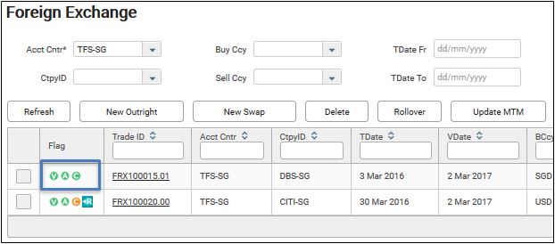 11. Click Back Button to return to the Foreign Exchange screen. Notice the C in the Flag column changed to green, which means the transaction is already confirmed.