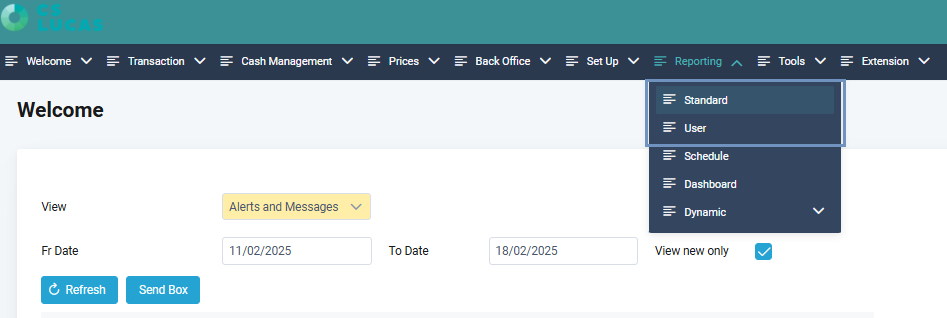 1. To print reports, click Reporting from the main menu. Choose to print standard or user reports. In this example, standard is chosen.