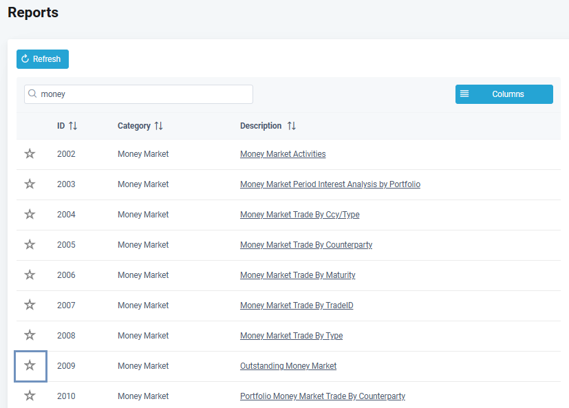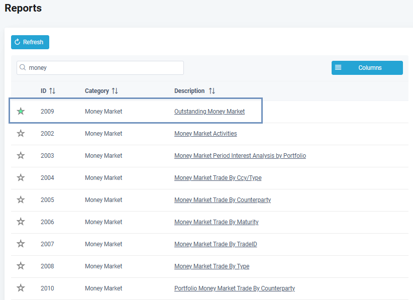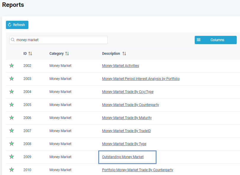 4. Click on the Description hyperlink in the list to print the desired report. In this example, Outstanding Money Market is chosen.