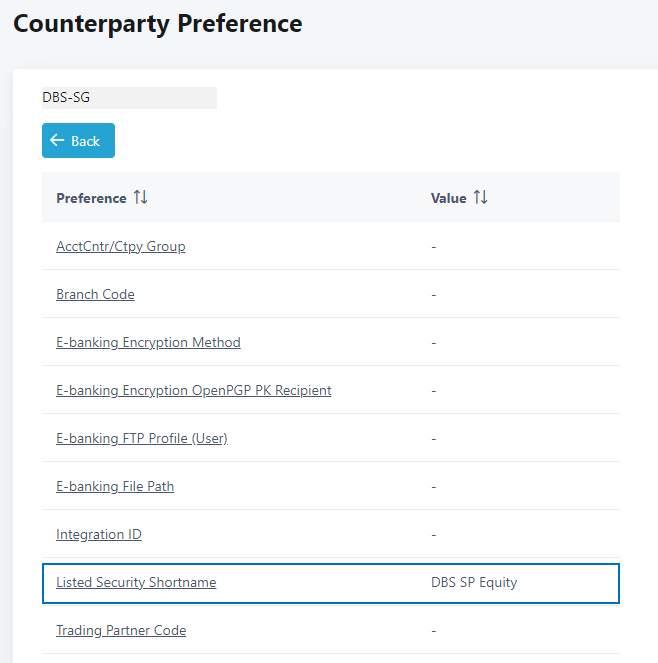 Note: To retrieve counterparty credit ratings, please need to create a new Equity type of security. For example, “DBS SP Equity”. To link the security created for this counterparty, enter “DBS SP Equity” in the “Listed Security Shortname” field in the Counterparty Preference screen. Navigate to Set Up > Static > Counterparty. Click on counterparty short name. Click on Preference button. |